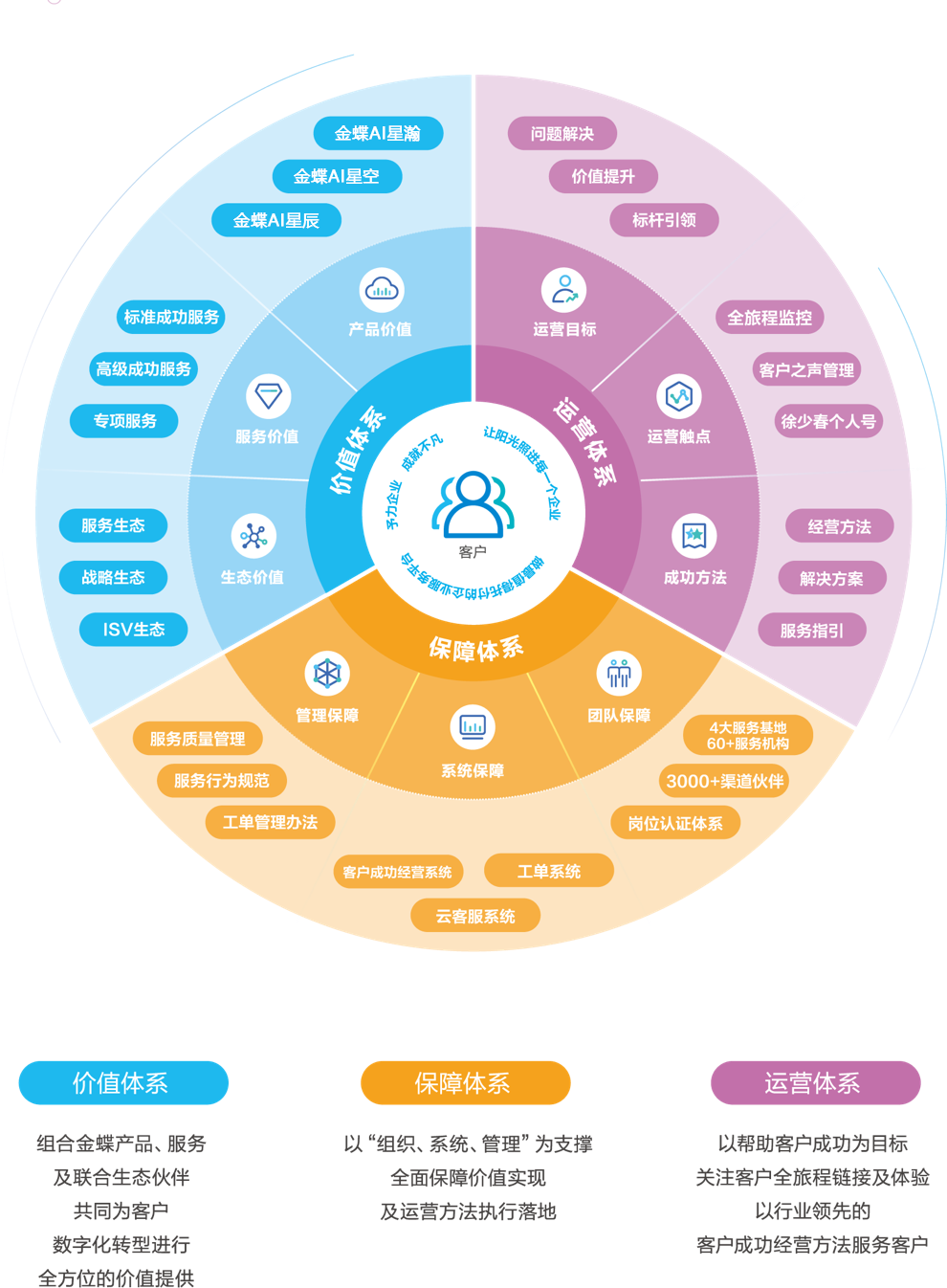 为达成客户成功目标,以金蝶哲学为指导,持续利用新技术、新架构、新模式为客户提供卓越的全旅程体验,持续为客户创造高价值服务