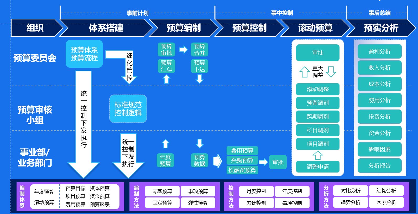 通过预算编制,将企业全部经营活动的计划、目标以数量形式具体而系统地反映出来,形成年度预算管理方案,通过预算分析,反馈预算执行结果、差异原因,并据此制定相应解决方案,实现预算及时优化;通过预算调整流程,规范预算调整业务,使得预算管理形成一个既有规范,又能保持相当灵活性的体系,保证预算体系的长期有效;通过预算系统与采购业务处理集成应用,使得预算得以控制。这样一来预算编制、监督控制、分析调整考核实现一体化,可以随着企业预算管理体系的逐步发展而发展,最终建立起全面的预算管理体系。