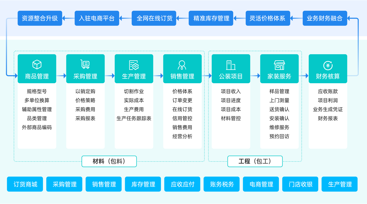 从订货、送货、安装到维修等销售全流程管理,从项目合同、项目成本、项目收款到项目进度等进行项目全生命周期管控,为五金建材行业提供供应链、生产、项目管理、财务一体化解决方案