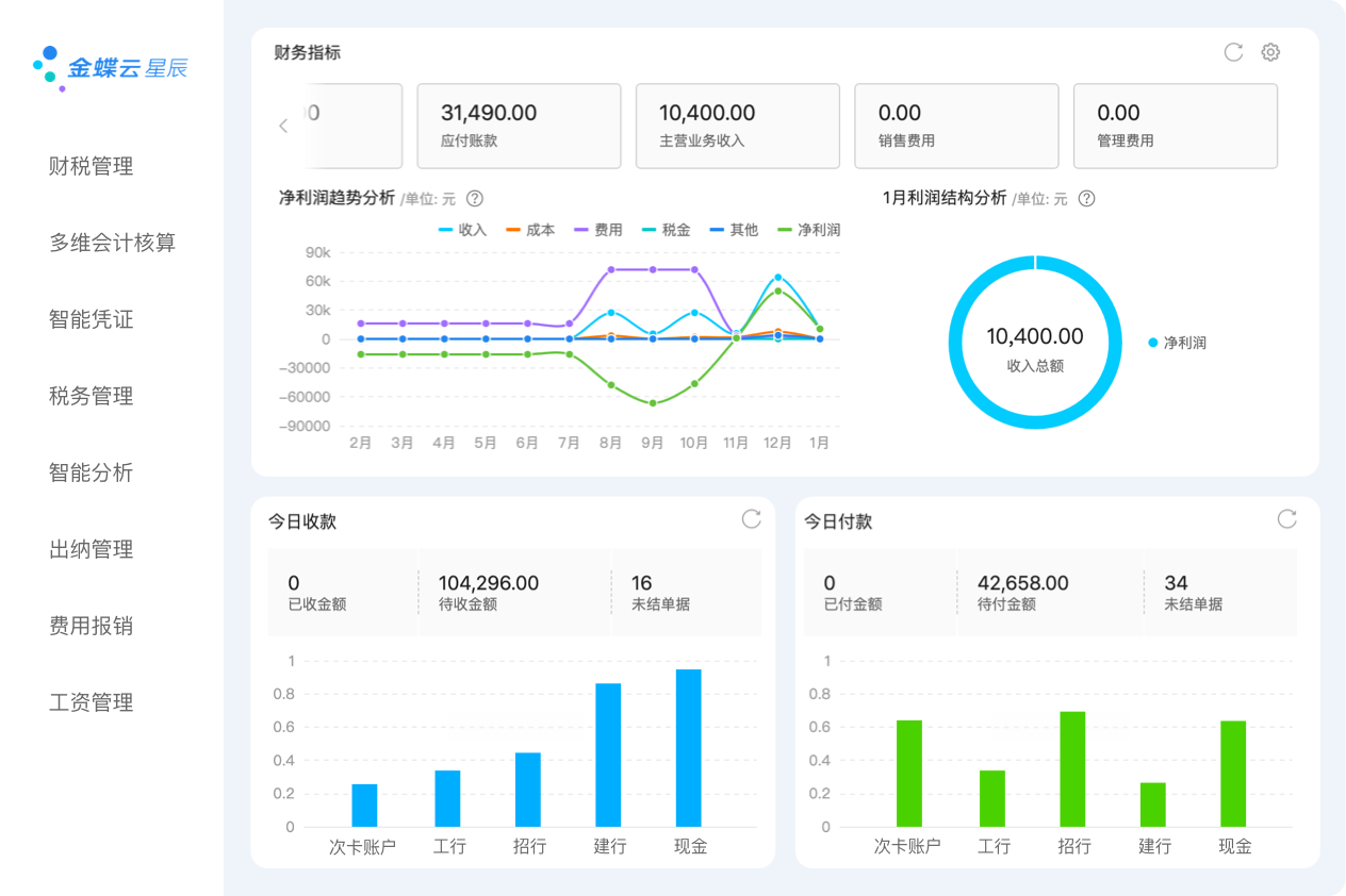 金蝶云·星辰聚焦小型企业在线经营和数字化管理,以“新财税、新营销、新平台”三大特性赋能企业,提供财务云、税务云、进销存云、订货商城、费用报销等SaaS服务,支持小型企业拓客开源、智能管理、实时决策,是一款适合小微型企业的云端财务进销存管理软件。