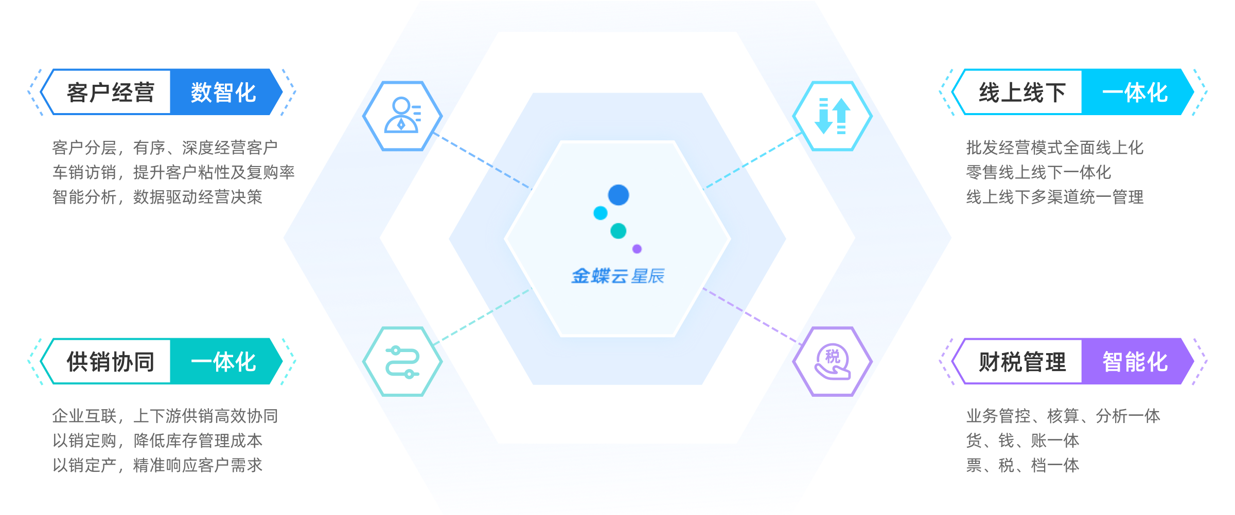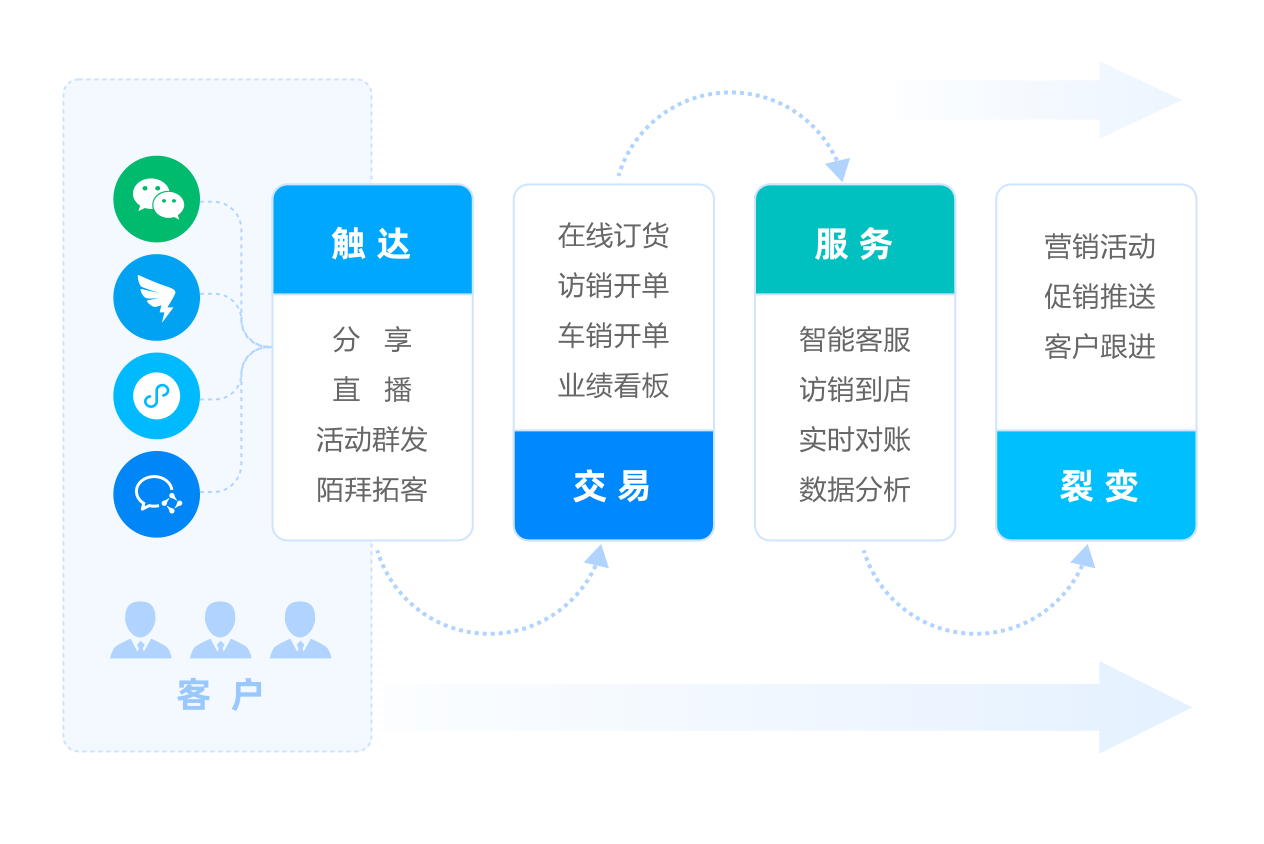 围绕“触达-交易-服务-裂变”的客户经营链路,在每个节点帮助企业构建客户经营的数智化服务能力,打造“极致交易体验”+“数字化管理”,帮助企业实现业务的线上化和数据的可视化,提升企业经营业绩