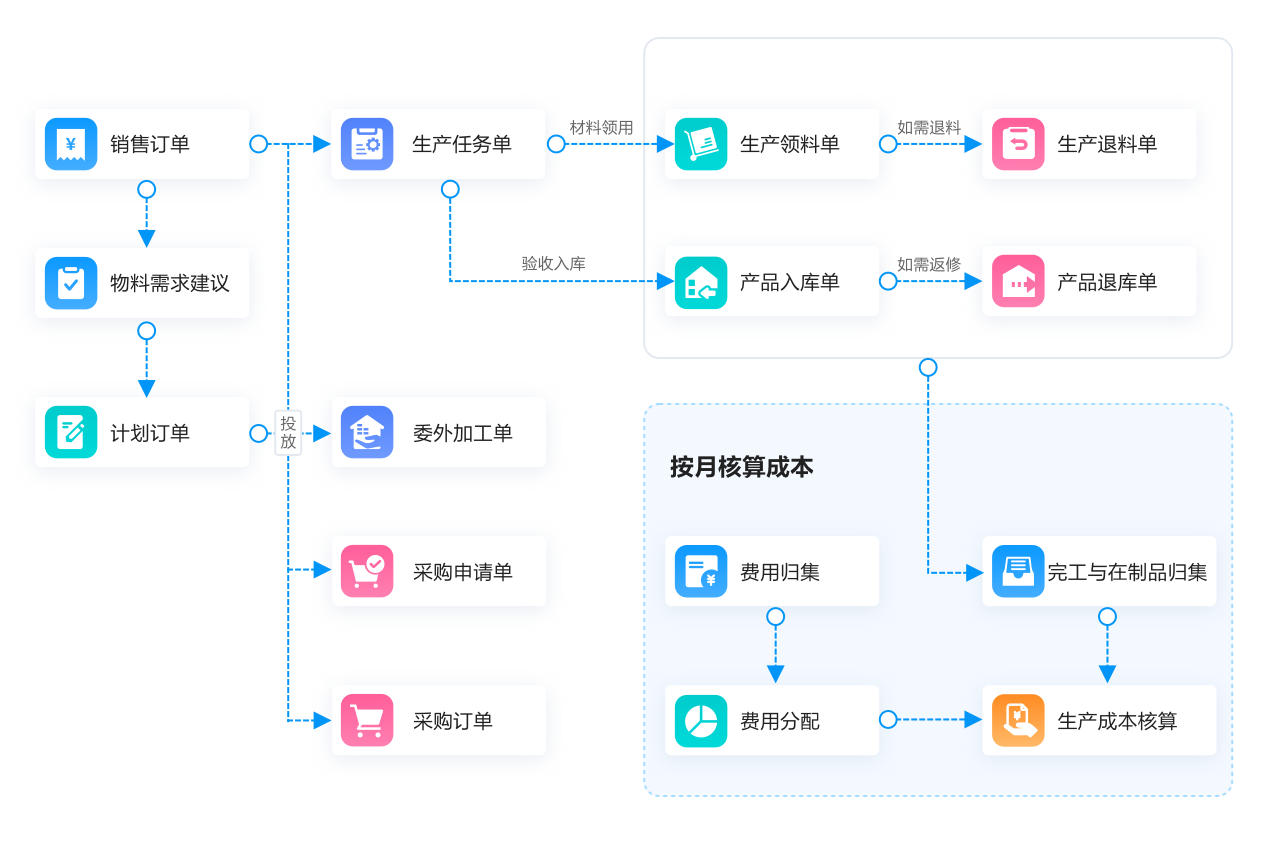 实现销售、采购、生产、核算等业务流程规范化管理,严格管控领料、出入库等生产过程,精准核算生产成本,提升生产、采购、销售等部门协同能力,帮助企业提升整体竞争力